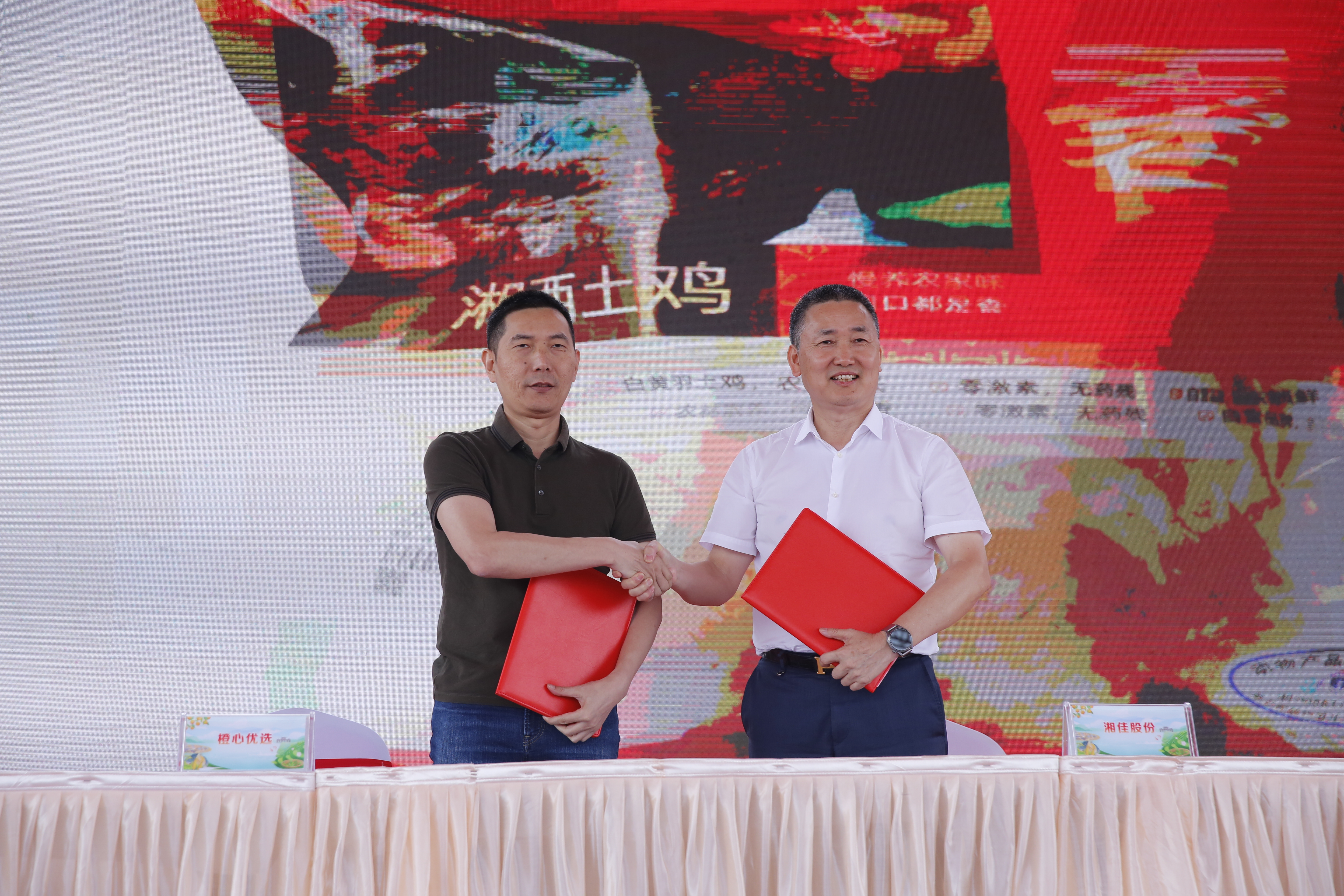 橙心優選肉禽蛋水產品類總經理余正友與湘佳股份董事長喻自文簽署合作協議