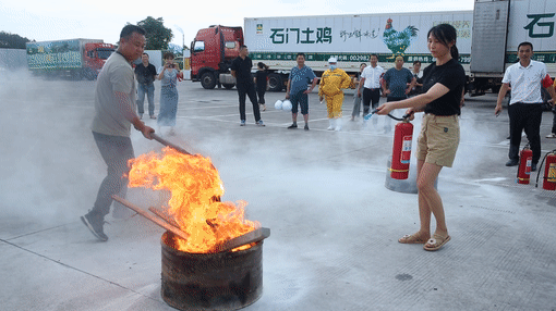 為了讓每位員工在“火情”發生時能迅速作出正確反應,湘佳食品產業園安全員教給員工們使用滅火器的四字口訣——提、拔、對、噴,并現場演示了滅火器的使用方法,滅掉了鐵桶里正在燃燒的柴火。