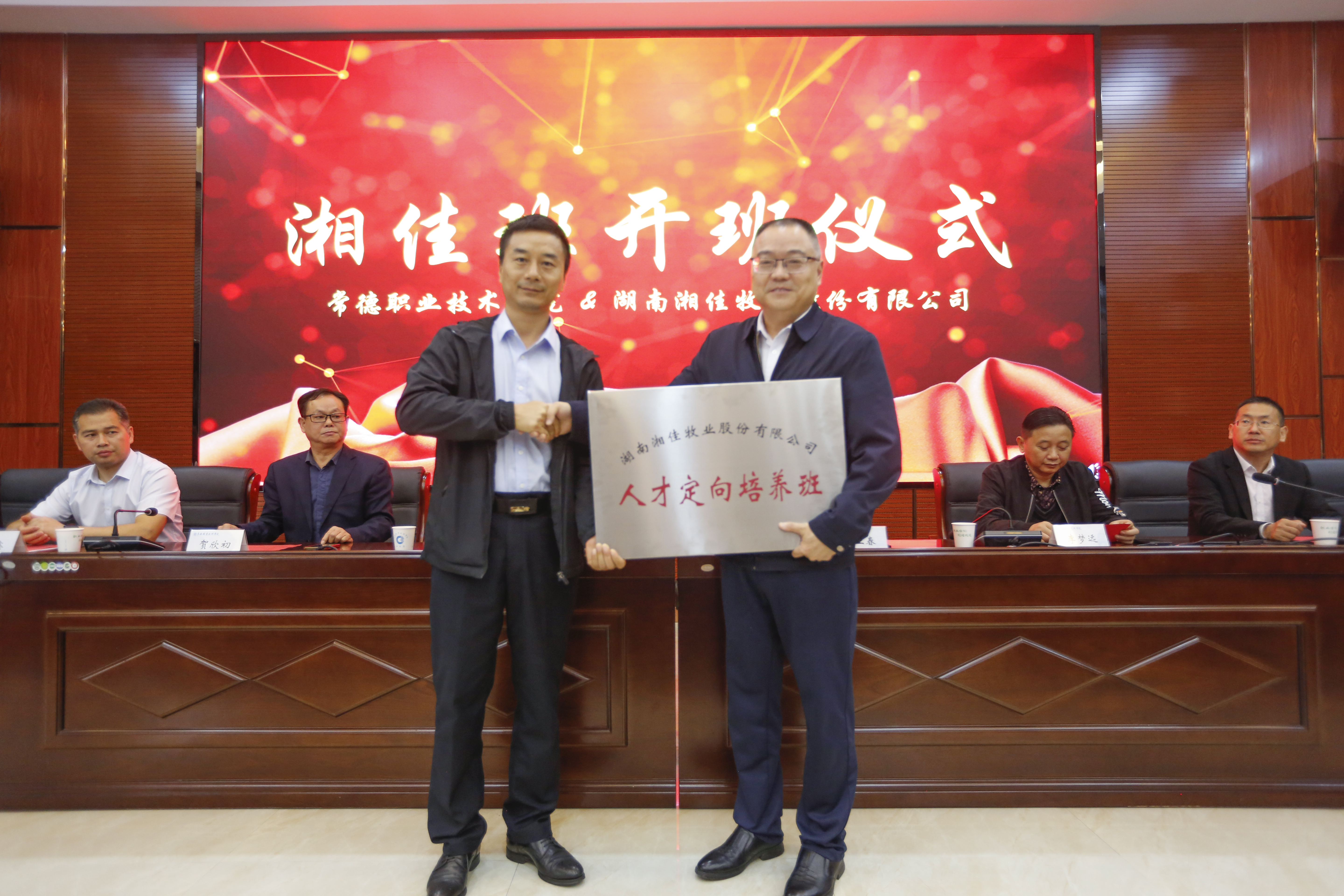 典禮上,何業(yè)春副總裁向常德職業(yè)技術(shù)學(xué)院農(nóng)業(yè)與經(jīng)濟(jì)系主任顧振華授“湘佳人才定向培養(yǎng)班”牌,徐翔副書記、何業(yè)春副總裁為班主任唐慧、劉紫薇頒發(fā)班主任聘書,學(xué)院領(lǐng)導(dǎo)為湘佳股份代表頒發(fā)導(dǎo)師聘書。“湘佳班”學(xué)生代表冉家豪上臺發(fā)言。